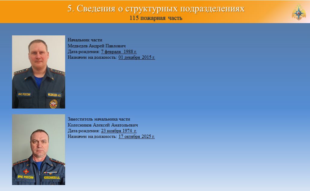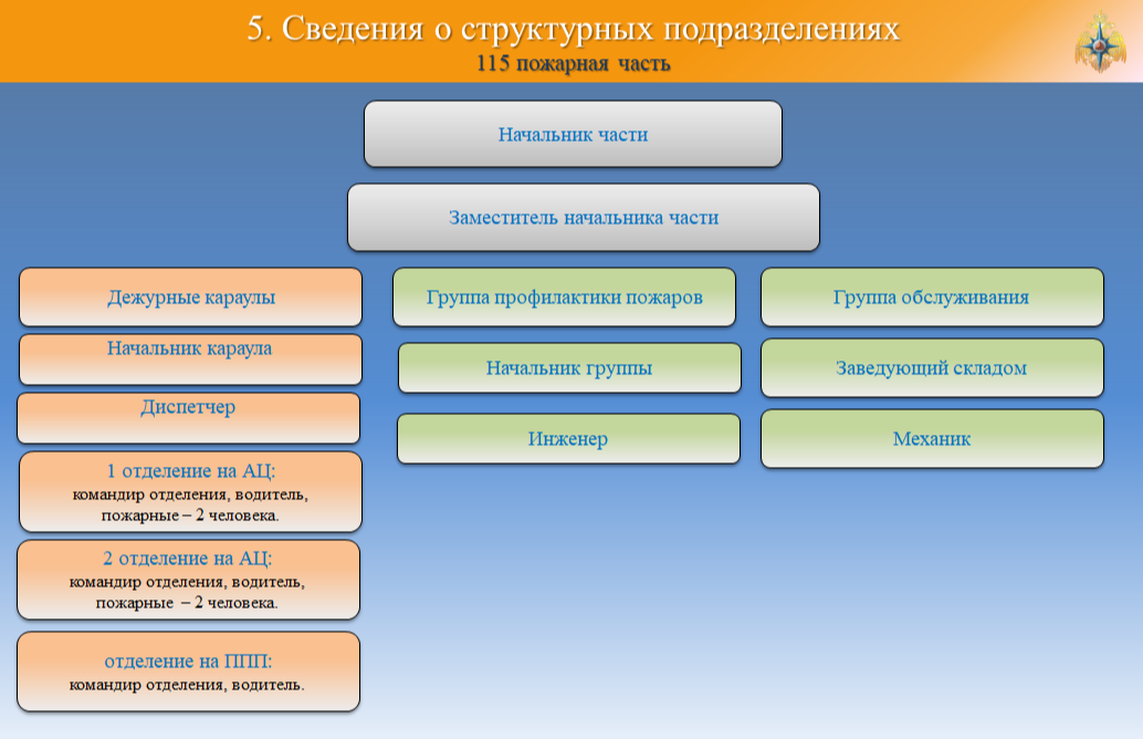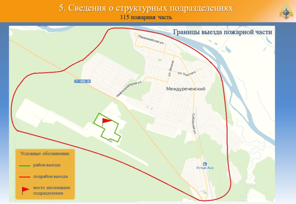 115 ПЧ отряда ФПС ГПС-Югорский филиал ФГБУ «Управление ДП ФПС ГПС № 4» расположена на территории Кондинского района Ханты-Мансийского автономного округа Югры п. Междуреченский ул. Нефтепроводная 10 с численностью населения посёлка 12222 человека Здание площадью 1320м2 расположено на территории ЛПДС «Конда» филиала Урайское УМН. Здание пожарного депо представляет собой двухэтажное административное здание с гаражом. На первом этаже административного здания расположены служебно-бытовые помещения, пункт связи части, учебный класс, комната приема пищи. В здании пожарного депо расположены складские помещения, обслуживающий пост ГДЗС, рукавный пост, служебные помещения, пост технического обслуживания пожарных автомобилей, гараж для пожарных автомобилей на 4 бокса. Год постройки — 2002г.